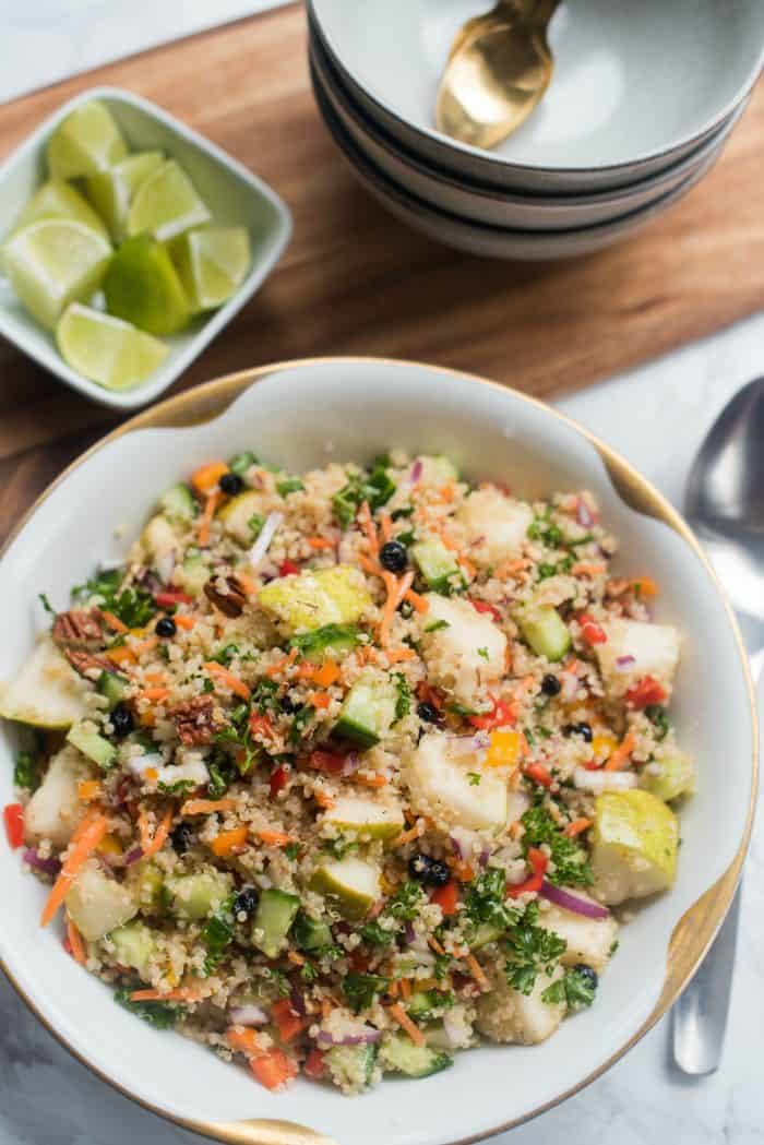 Ein kühler Tag bettelt um einen warmen Quinoa-Salat. Dieser Salat wird mit einem subtilen Mandel-Aroma, Squash und Salbei, den Ruf von Quinoa für immer ändert. Duftend, mit einem Senf- und Olivenölboden, der von fruchtiger Birne aufgebrochen ist.