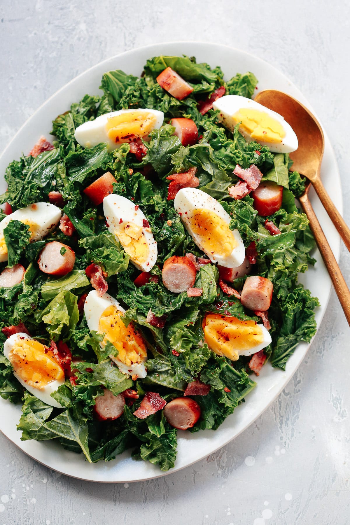 Wer würde nicht dachten, Frühstückssalate könnten etwas sein? Dank einer Dosis hart gekochter Eier, Frühstückswurst und Speck, macht dieser Salat den Erstaunen von Kale und sorgt dafür, dass Sie Ihre tägliche Dosis Vitamine und Ballaststoffe erhalten.