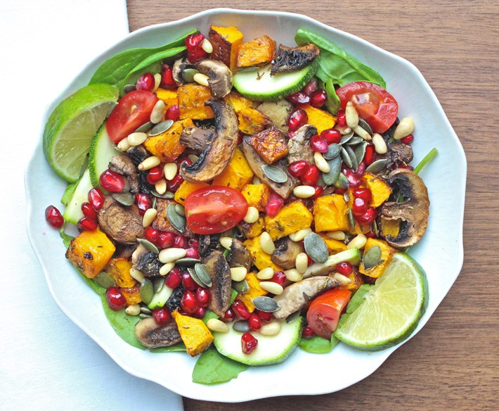 Herbed und geröstete Squash-Mischungen mit fleischigen Pilzen für einen vegetarischen Salat, der alles andere als Sanft schmeckt. Spinat, Zucchini und Tomaten mit einer Handvoll Nüsse und Samen schaffen eine glatte Harmonie mit dem Rosmarin-Thema und ermöglicht einen sehr komplexen Geschmack.