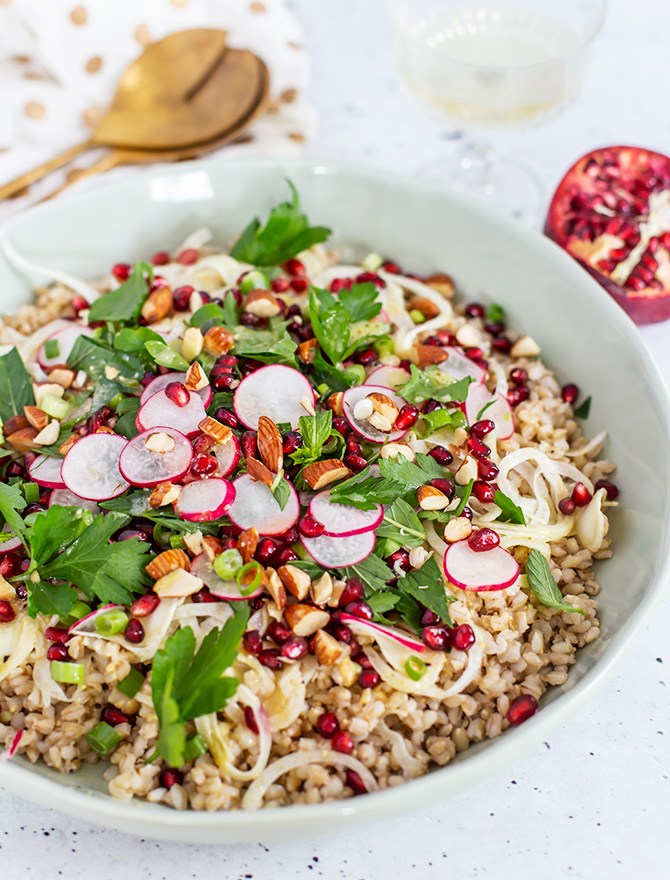 Dies ist technisch als Urlaubsgericht dargestellt, aber wir glauben, dass es jederzeit arbeitet, und ist ein Hit mit jedem, der es versucht. Granatapfel und Fenchel glänzen an einem Bett der Pearl Gerste. Dieses vegane Gericht ist so hübsch wie lecker, mit unterschiedlichen Farben und Texturen gefüllt.