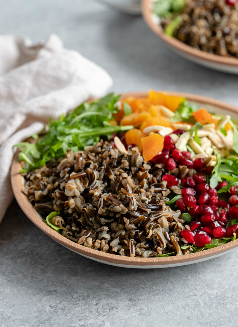 Reis ist gut mit einer Reihe von Küchen, aber im Winter würden einige argumentieren, dass es eine willkommene Ergänzung zu einem Salat ist. Nussig, wilder Reis fungiert als Basis und mischt sich in getrockneten Aprikosen und Rugel. Geröstete Mandeln, und Granatapfel sind mit einem hellen weißen Wein-Essig-Dressing absolviert.