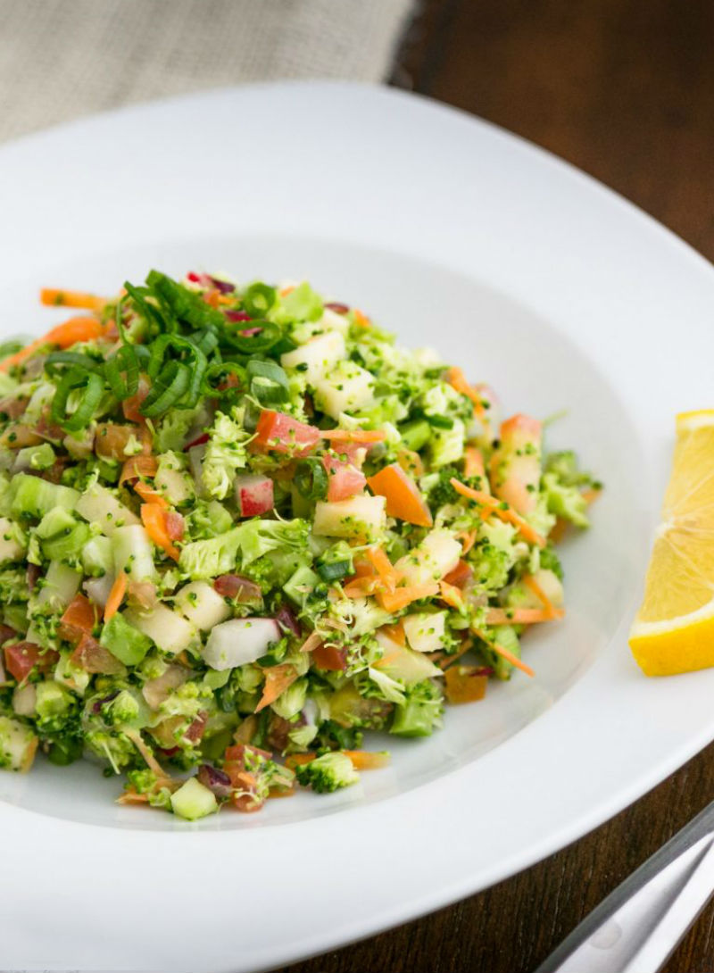 In Cheddar-Sauce getaucht war vielleicht der einzige Weg, den Sie mit Broccoli essen, aber dieser Salat ist dabei, Ihnen eine völlig neue Welt zu öffnen. Mit Vitaminen geladen, kann diese Superfood-Mischung bis zu drei Tage im Kühlschrank dauern, ohne grob zu werden. Es ist lebendig von Äpfeln, Trauben, Grünzwiebeln, Karotten, Tomaten, Rettichen und optionalen trockenen Cranberries hergestellt.