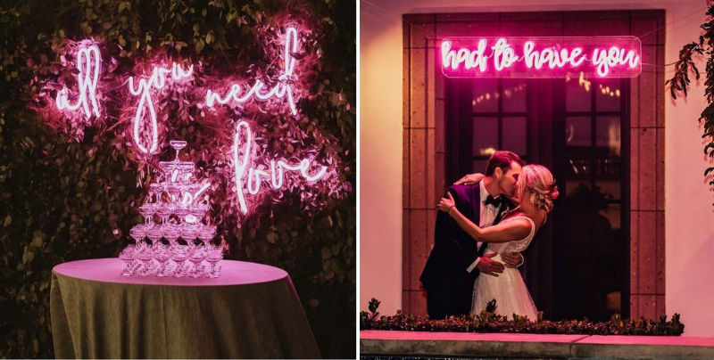 Dieser sehr instagrammierbare Trend stellt eine zeitgenössische Wendung auf Hochzeitsschilder, die wir lieben. Dieser elektrische Trend kann von einem einfachen Monogramm bis zu einem Liebes-Dovey-Slogan reichen.