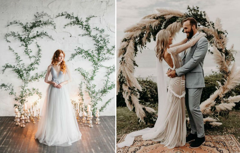 Konventionelle Blumenbögen werden durch Bögen aus Gras ersetzt. Insbesondere Pampas Gras ist sehr romantisch und ergibt eine böhmische Ästhetik mit einer neutralen Farbpalette.