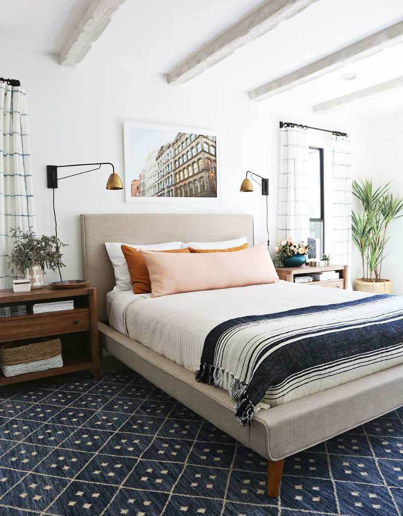 Der häufigste Fehler im Schlafzimmerdesign bringt den Teppich am Fuß des Bettes. Es ist absolut lächerlich. Wer wird es dort benutzen? Niemand kommt jemals dort aus dem Bett. Du kommst immer rein und aus dem Bett auf der Seite, also sollte der Teppich sein. Sein Hauptzweck besteht darin, Ihre Füße warm und gemütlich zu halten, damit Sie morgens nicht in den kalten Boden treten müssen. Entweder erhalten Sie einen Teppich groß genug, um das gesamte Bett und die Umgebung umzusetzen, oder erhalten Sie zwei kleine Teppiche für jede Seite.