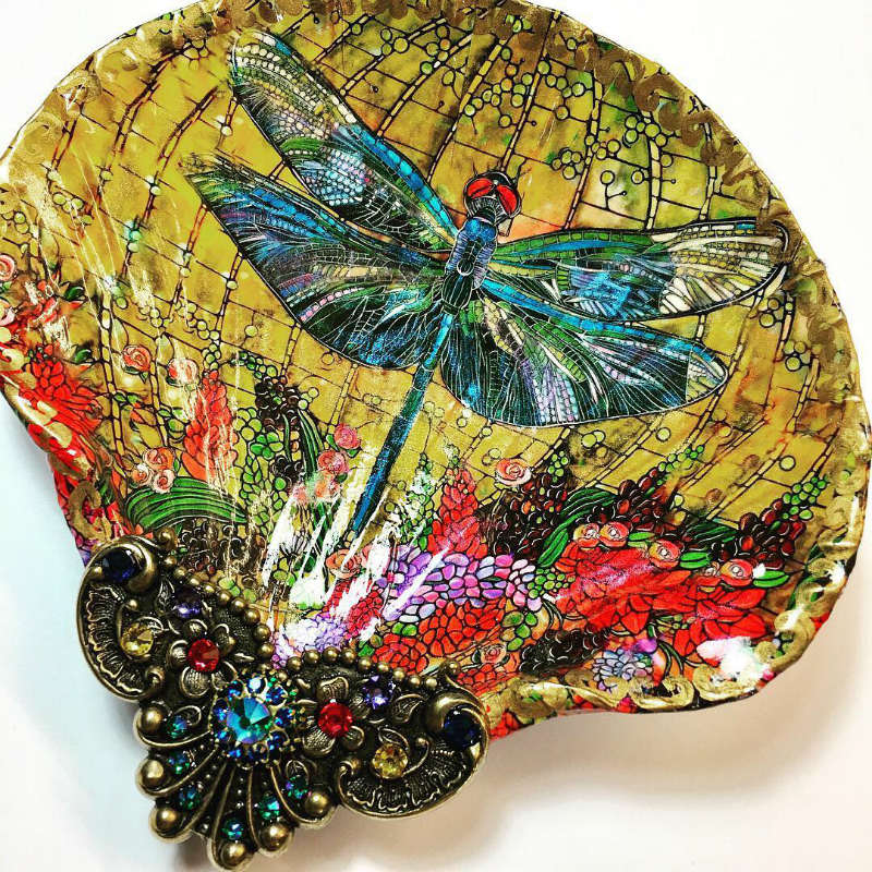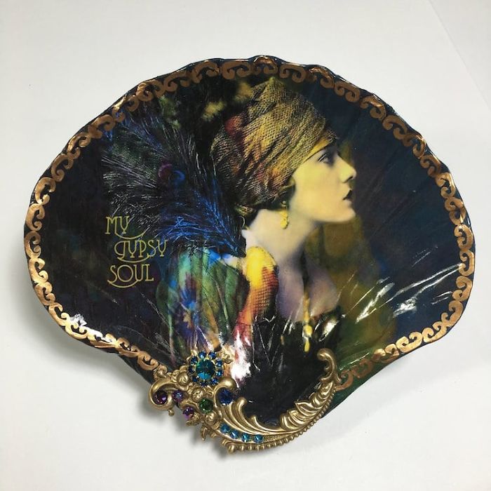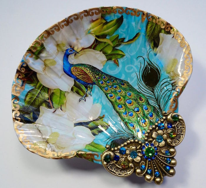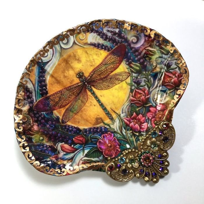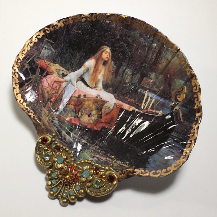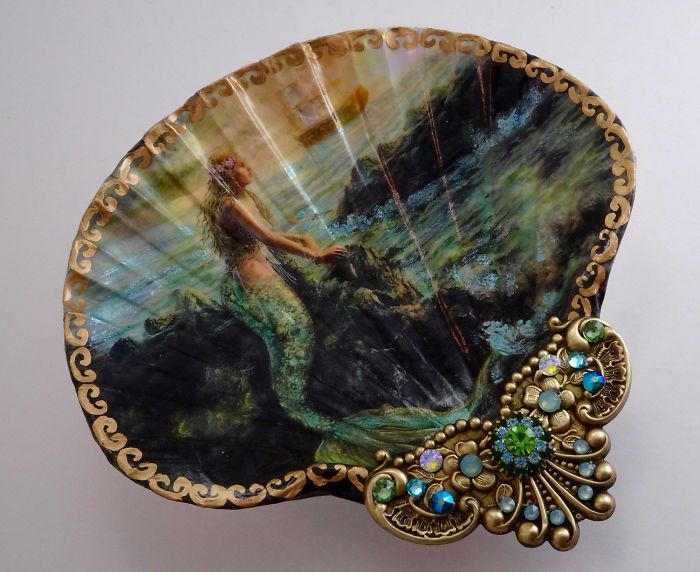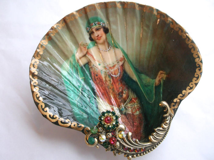 Mary Kenyon, ein Künstler aus Kalifornien, fand einen Weg, um Kunst zu schaffen, die sowohl schön als auch nützlich ist. Sie benutzt Muscheln als Leinwand und schafft wunderschöne viktorianische, schauende Schmuckgerichte von ihnen. Sie sagt, dass ihre Hauptquelle der Inspiration ihr Vater ist, der Ölmaler war, und dies ist der Weg, in seinen Fußstapfen zu folgen. Während Maria nicht gerade Bilder auf Muscheln malt, fügt sie stattdessen die Decoupage zu entweichen, fügt sie mit Goldfarben und Kristallen wenig abschließende Akzente hinzu. Dies macht ihre Kreationen wie antikes Zubehör und kleine Schätze aus.