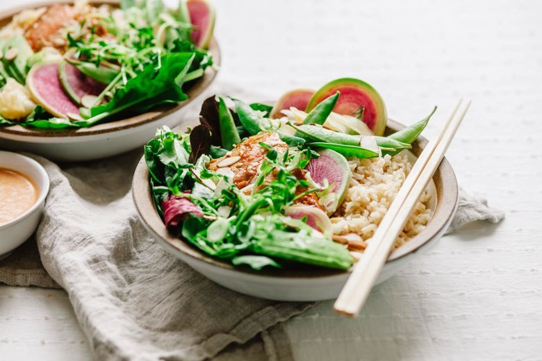 Wir sind ziemlich sicher, dass jeder von Poke Bowls besessen ist, also ist hier ein Frühlingsrezept für Sie. Dieser hat Lachs in ihm gebacken, der ein gutes Protein und Omega 3 und ein paar leckere Gemüse hinzufügt. Die Marinade-Verwendung für den Fisch ist jedoch etwas aus dieser Welt. Ein bestimmter muss versuchen!