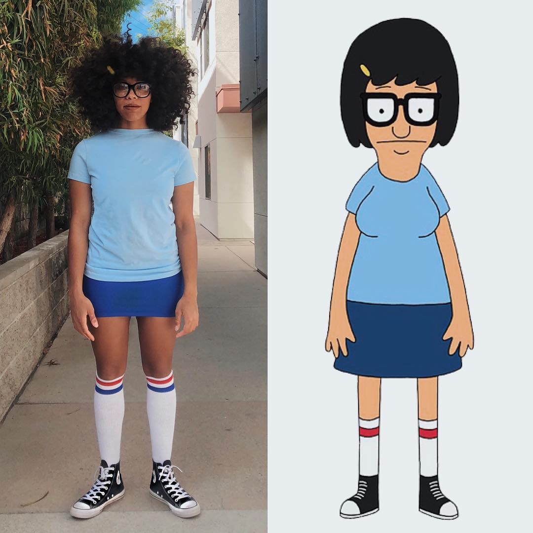 Wir lieben sie nehmen auf Körper positive Champion Tina von Bob Burgers, komplett mit blauem Minirock, gegenteil, Kniestrümpfen, und jener berüchtigten Brille.