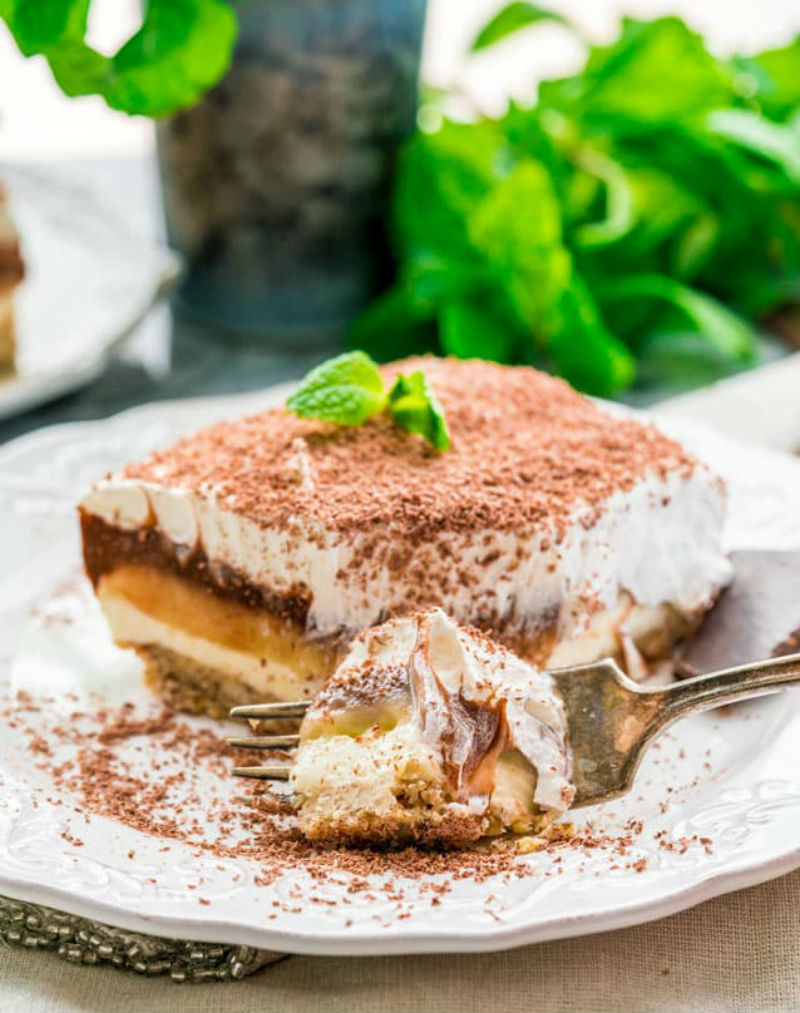 Dieser Name könnte ein wenig verblüffend sein, aber es ist zu 100% genau. Dieser meist-Pudding besteht, dass dieses köstliche Dessert eine knusprige Pekannusskruste hat, oberhalb von denen sechs Schichten Ihren Mund mit Schokoladenpudding, Vanillepudding-Schlagsahne füllen, und Puderzucker gesüßtem Frischkäse.
