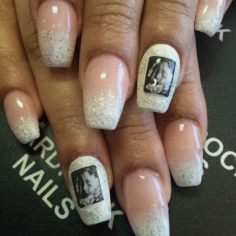 Die Menschen fordern den Look „Ultraschall Nägel“, und es sich um sanfte, subtile Wirbel von Schwarz und Weiß. Manche Mütter entscheiden sich für nur die Silhouette des Fötus Kopf Gestaltung und Hände, und entblößte den Entwurf auf einem einzigen Finger.