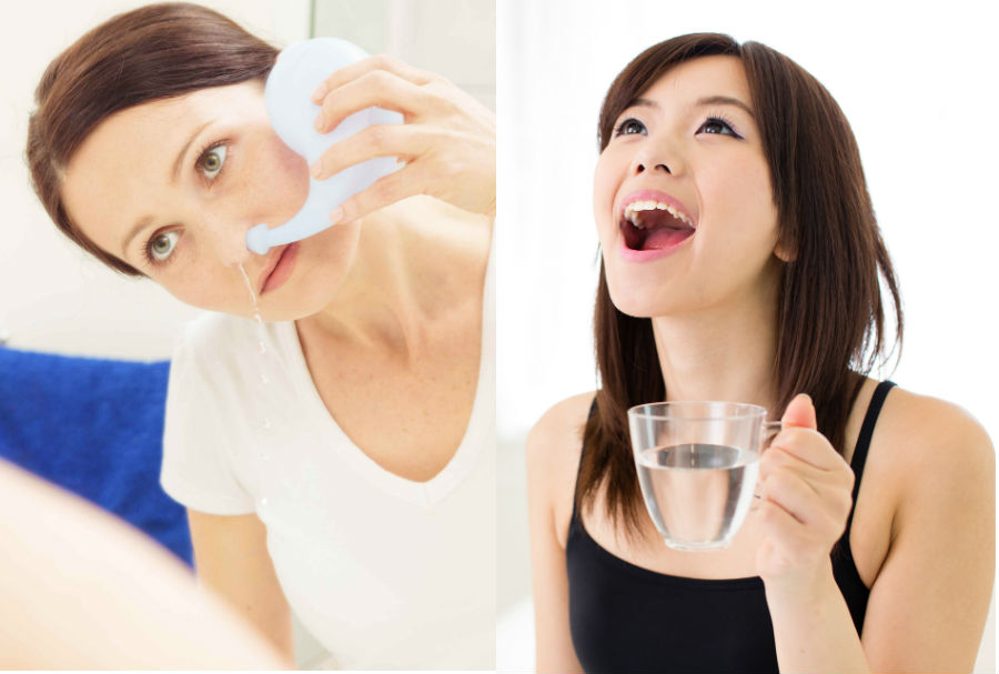3. Gurgeln mit Salzwasser oderSpülen Sie Ihre Nase durch einen Neti-Topf. Dieses Spülen des Spülens mit Salzwasser bricht die Überlastung auf und beseitigt Bakterien und Viren, die in der Nase hängen.