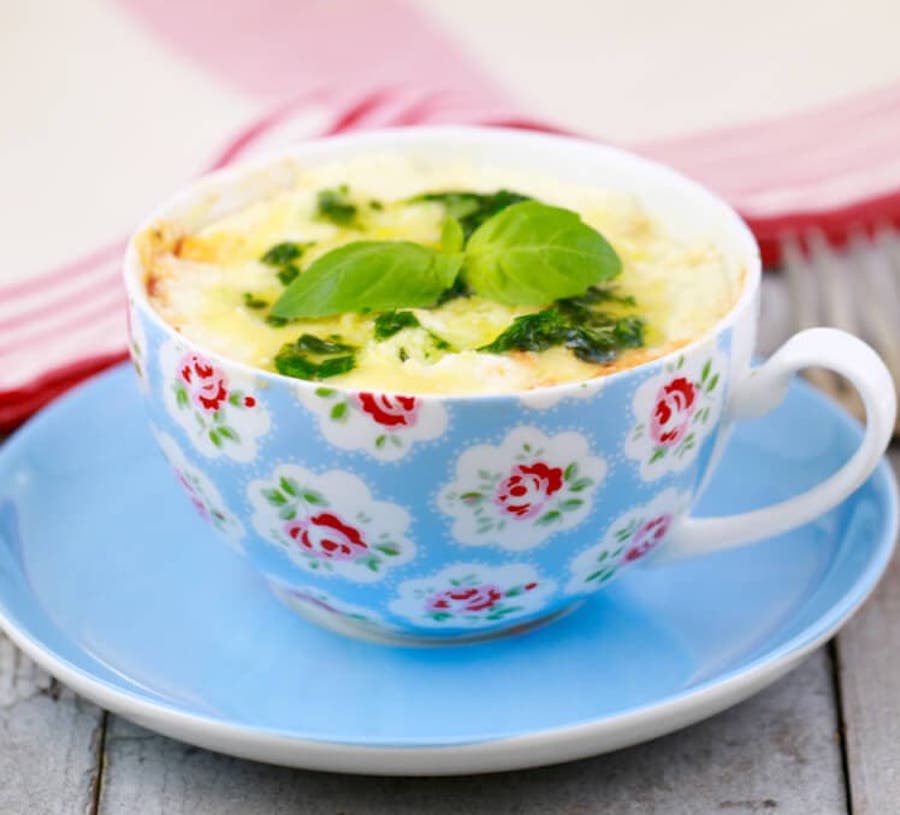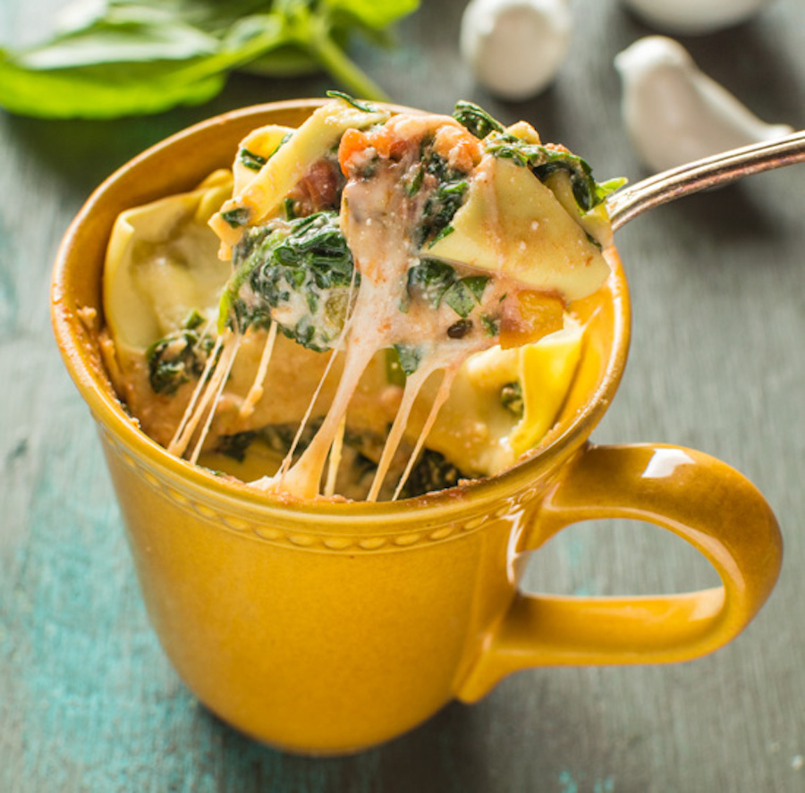 Dies ist eine weitere Lasagna-in-A-Becher-Situation, die den Schwerpunkt auf Ricotta und Spinat aufnimmt. Popeye wäre stolz darauf, dass Sie immer noch Ihre Grüns inmitten all dieser High-Natriumkohlenhydrate bekommen. Wenn Sie sich für Fleisch entscheiden, stellen Sie sicher, dass er zuerst vollständig gekocht ist.