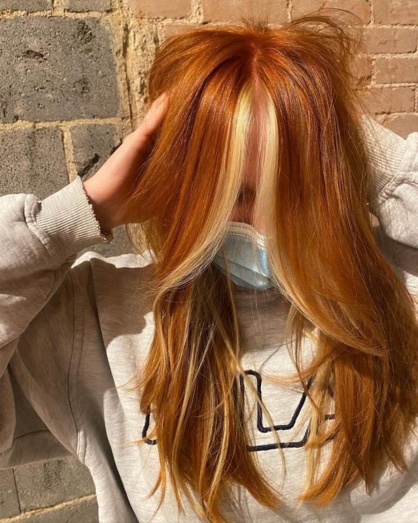 Dies ist ein toller Look, wenn Sie sich nicht für einen vollköpfigen Farbstoffjob verpflichten oder mit einer hellen und gewagten Farbe experimentieren möchten. Es ist im Wesentlichen ein Pop von Highlights, die an der Teilzeile vorne beginnen. Betrachten Sie einen zwei getönten Anschluss, wie Bella Hadid mit ihr ausprobiertrötlich-orange Streifen. Die Farben von 90er Jahren machen ein Comeback mit diesem Look! Es ist trendig und geringer Wartung und ermöglicht es Ihnen, einen neuen Look nahtlos zu integrieren.