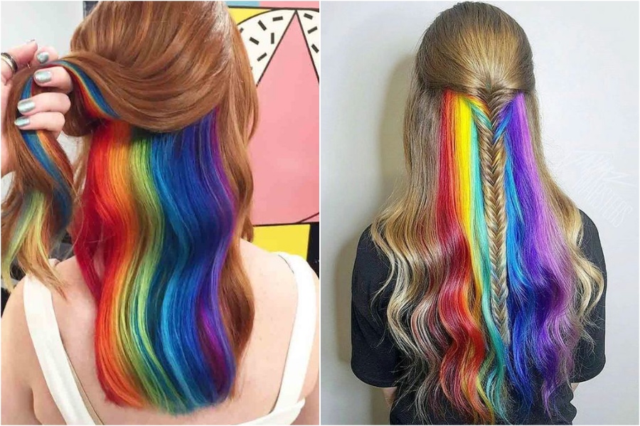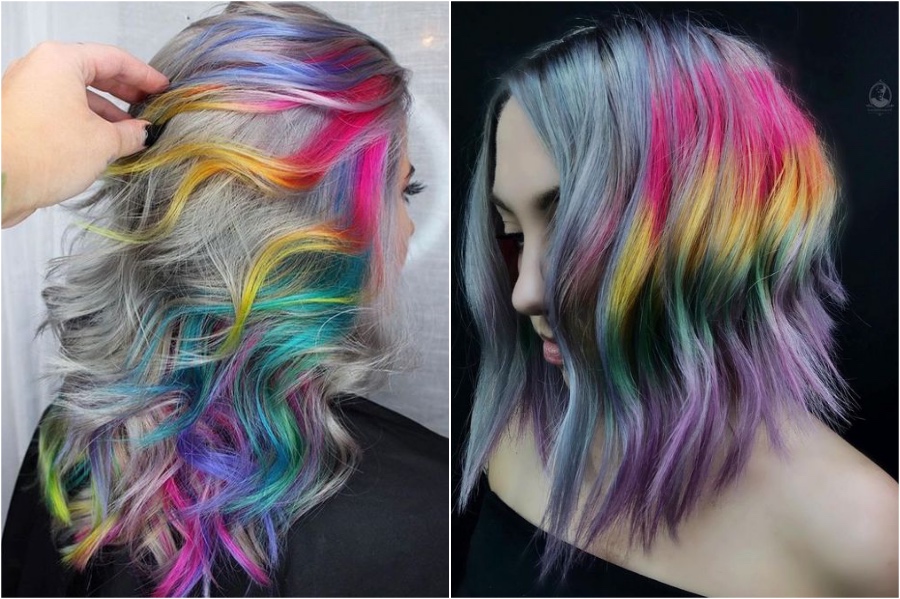Wenn Sie nur die oberen Schichten Ihrer Haare in Regenbogenfarben entscheiden, erlauben Sie viel mehr Kreativität mit dem Rest Ihrer Haare. Diese Art von Regenbogenhaaren würde mit dunklen und hellen Haaren gut aussehen, und natürlich wird Silber auch als Hintergrundfarbe zertrümmert.
