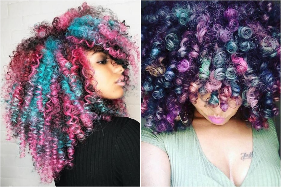 Das ist, worüber ich sprach, als ich sagte, dass Regenbogenhaare auf irgendeiner Haarlänge und Textur gut aussieht. In meinem bescheidenen Meinungsverhältnis sieht das Regenbogenhaar auf Locken noch besser aus. Es ist nur viel Spaß und spielerisch, egal wie eng oder groß Ihre Locken sind.