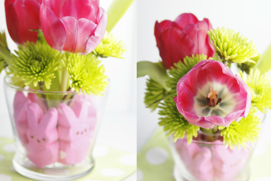 Wenn Eier nicht wirklich Ihre Marmelade sind, sagt Ostern nichts wie eine Kiste voller Peeps! Süßigkeiten Liebhaber werden es lieben, diese Farben an floralen Arrangements zu passen und sie als Basis zu benutzen. Stellen Sie sicher, dass Sie auch ein kleines Glas innen mit Wasser legen - Niemand will soggy Peeps!