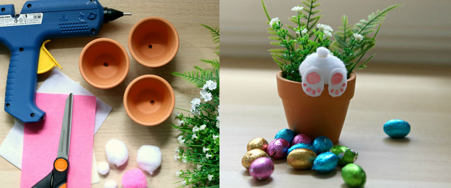 Gibt es irgendetwas nieser als diese kleinen Häschenknöpfe aus einem Pflanzenpot? Dieses schnelle und gudium freundliche Konzept verwendet farbige Filz, große und kleine Pom-Pom-Bälle, eine heiße Klebstoffpistole und Ostereier.