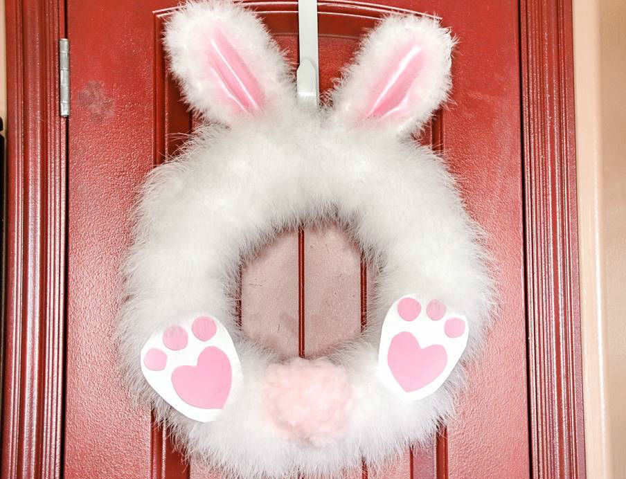 Nur weil der Winter vorbei ist, heißt das nicht, dass die Kranzsaison enden muss. Sag Hallo zu einer flauschigen weißen Wiedergabe mit satinrosa Bunny-Ohren und Pfoten, die auf spielerische Weise stößt, um die Besucher zu begrüßen.