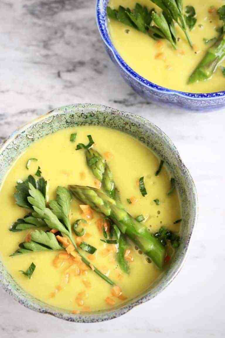 Es ist Frühling, also ist es Zeit, grün zu gehen. Diese Lichtcreme-Suppe ist genau das, was Sie für einen mühelosen und leckeren Start der Mahlzeit brauchen, der sowohl lecker als auch gesund ist. Wir wetten, dass Sie diese einzigartige, aber einfache Möglichkeit haben, Spargel zu essen.