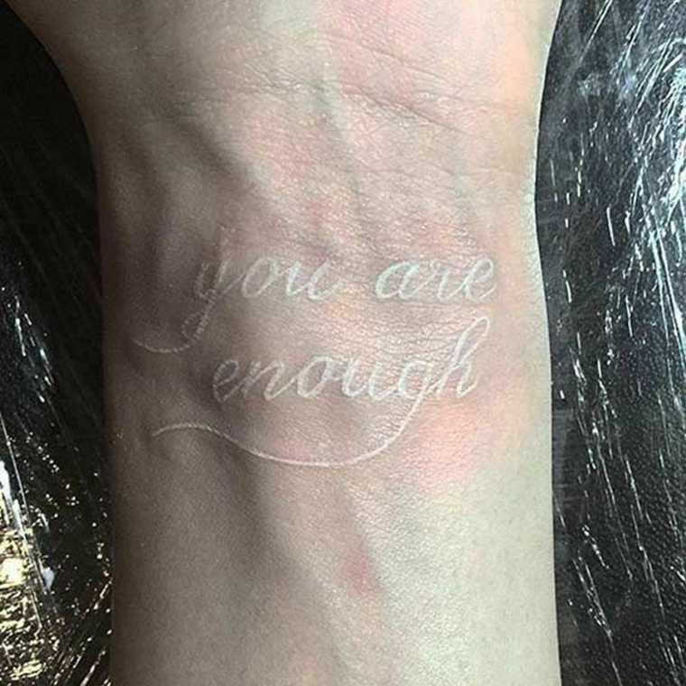 Ein Zitat auf der Innenseite des Handgelenks kann manchmal ein wenig intensiv in dunkler Tinte aussehen, aber in weiß, schafft es ein subtiles Gefühl der Geheimhaltung oder Geheimnisses. Dies kann ein Tribut an sich sein, einem geliebten Menschen oder eine tägliche Erinnerung.