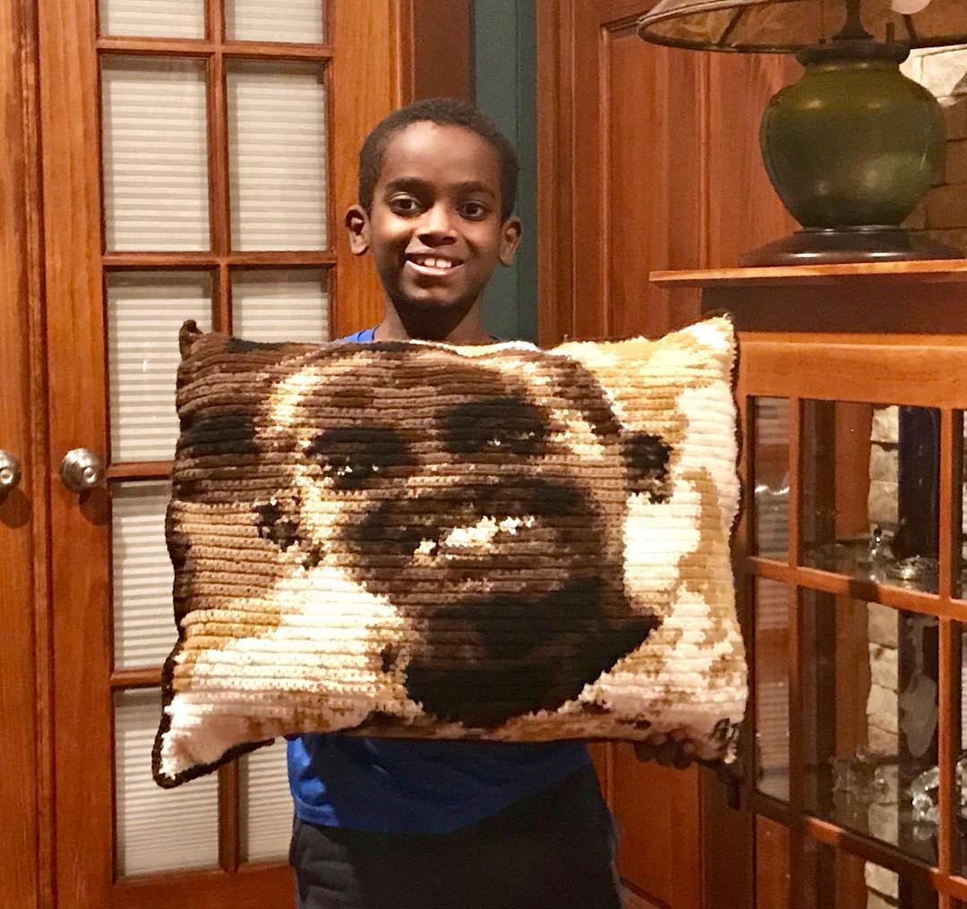 Jetzt häkelt Jonah nicht nur Ihre alltägliche Decke. Er hat ein resentlich realistisches Selbstporträt auf ein Kissen gehäkelt und in nur 46 Minuten einen erstaunlichen Hut auf der Pickler & Ben Show.