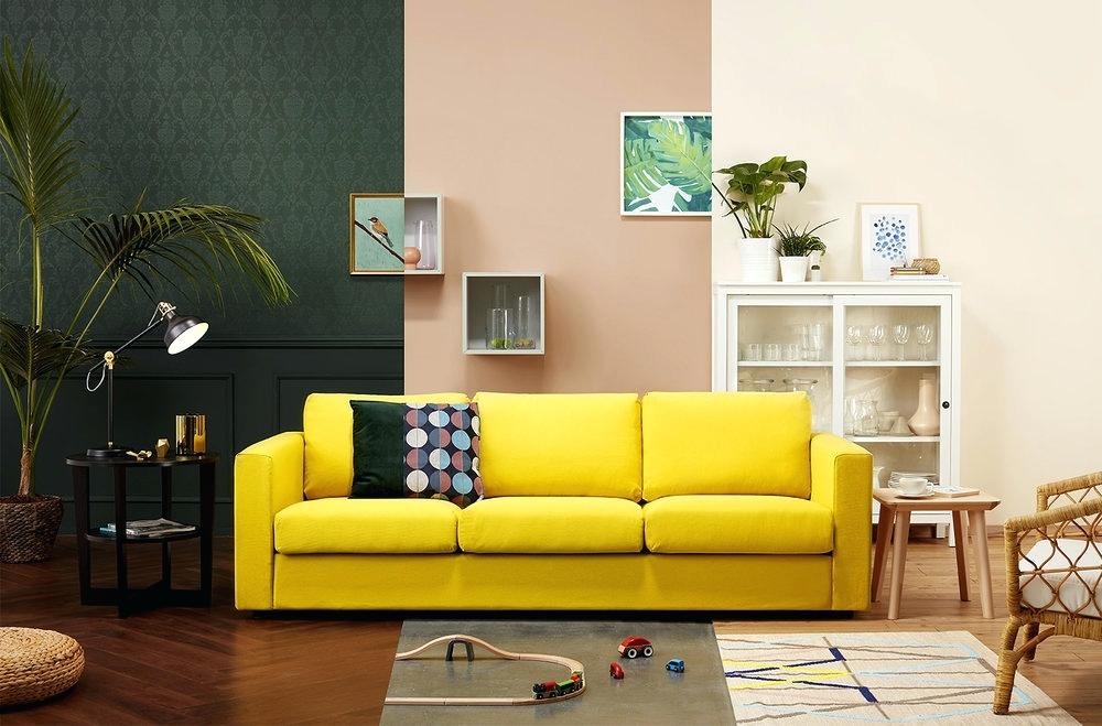 12. Malen Sie Ihr Zimmer, damit es mit einem Möbelstück, das Sie bereits besitzt, entspricht. Wenn Sie zum Beispiel ein modernes gelbeses Sofa haben, versuchen Sie es mit einer sonnengestalteten geometrischen Akzentwand, die von einigen Neutralen wie Sahne und Grau aufgebrochen ist.