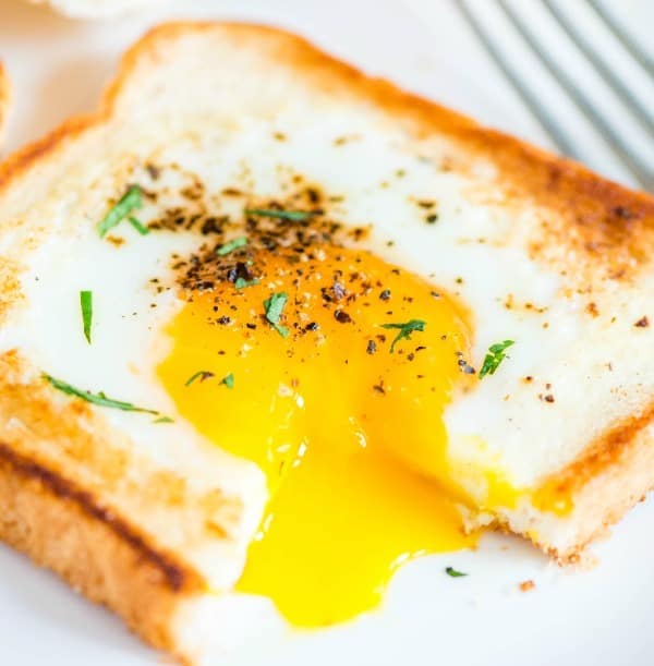 Eine lustige Mahlzeit, die ein Klassiker mit Kindern, Eier in einem Korb ist, auch als "Kröte in einem Loch" genannt - verfügt über ein Spiegelei, das in einem Toaststück eingebettet ist.