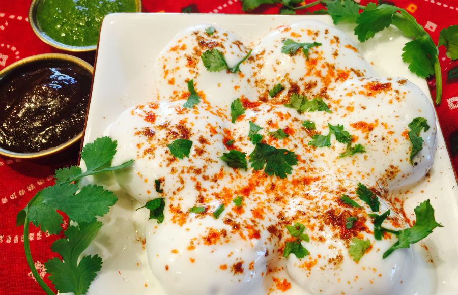 Dies ist ein traditioneller Snack aus dem Norden Indiens mit einem süßen und sauren Geschmack und sanfter Textur. Knödel aus Dal oder eine Mischung von Dals sind frittiert und serviert mit einem schweren Minzchutney, Quark und einer Handvoll Granatapfel für zusätzliche Crunchiness.