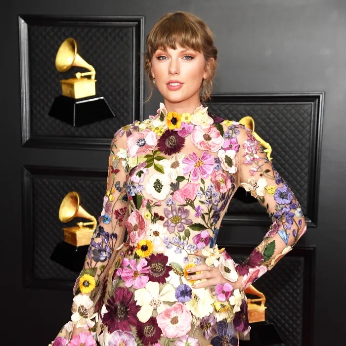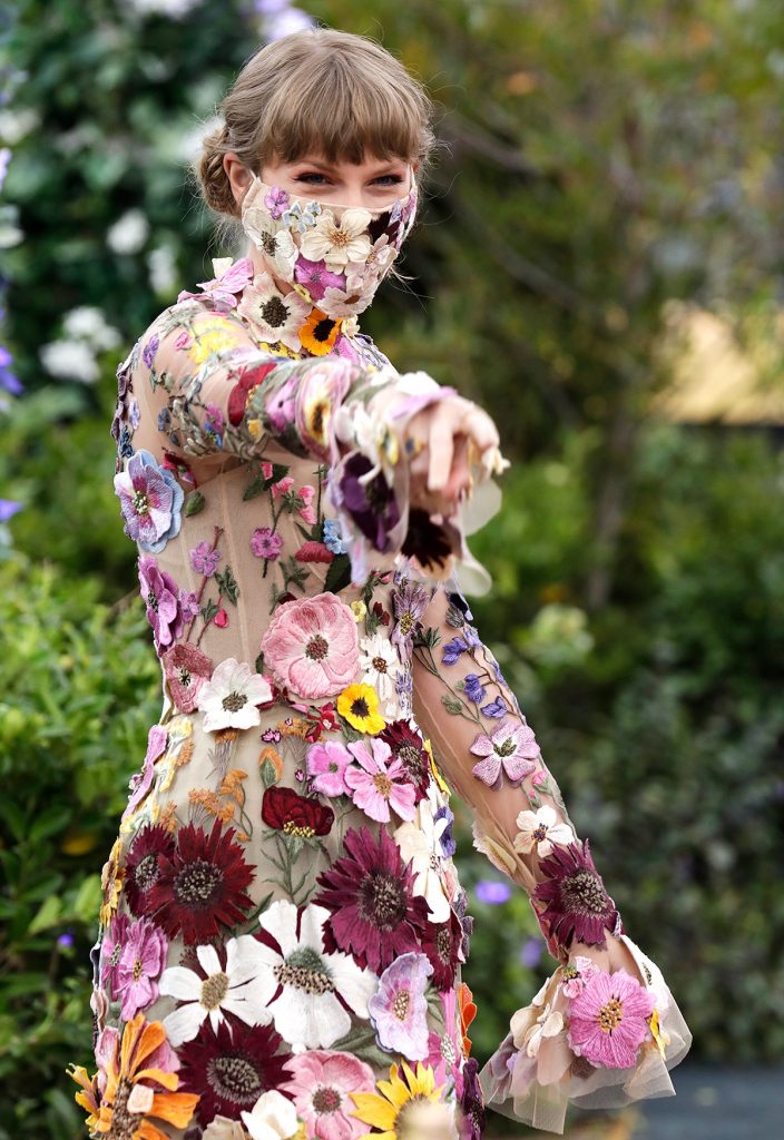 11. Taylor bei den 2021 GRAMMYs sah in diesem Blumenkleid absolut wunderbar aus und wir schätzten definitiv die passende Gesichtsmaske.