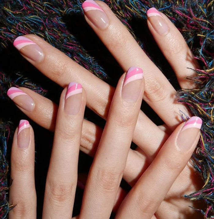 Gehen Sie für einfache rosa und lila diagonale Streifen, wenn Sie einen der negativen Weltraum-Nagelkunst-Designs selbst ausprobieren möchten. Es ist leicht zu machen, sieht aber immer noch ziemlich erstaunlich und auswirkungsvoll aus.