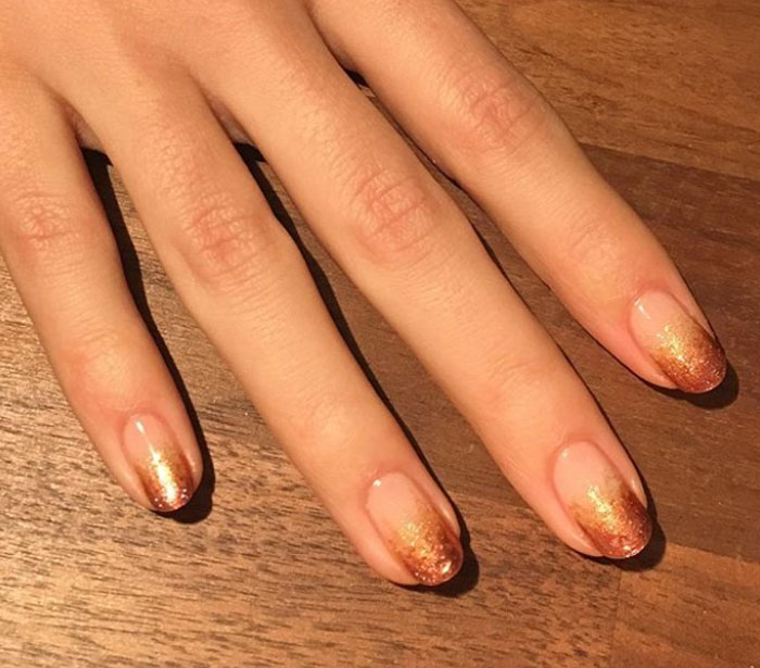 Diese glitzernde Goldmaniküre wird Ihren Tagesaussehen verlassen oder Ihre Abendkleidung noch mehr hervorheben. Wenn Sie ein goldenes Ombre machen, stellen Sie sicher, dass Sie die Farbnuancen ein bisschen etwas für den besten Effekt ändern.