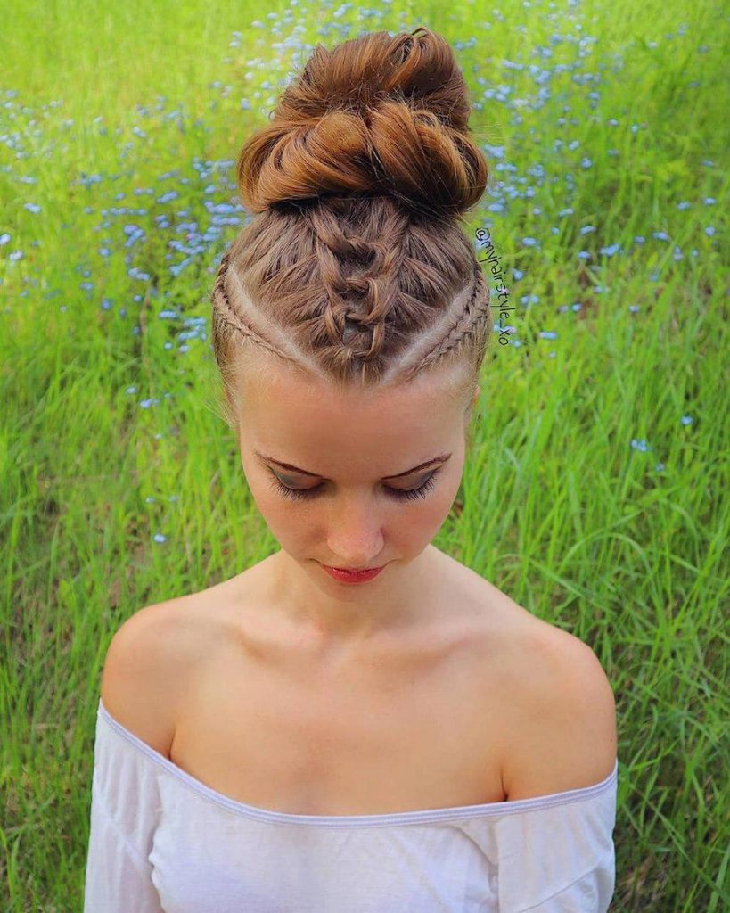 2. Diese Frisur beinhaltet ein geknotetes Braidand einige Spitzenzähne an den Seiten. Es ist eigentlich sehr praktisch und wird das Haar aufhalten, während sie sehr kompliziert und schön aussieht. Sie können dieses Look mit einem lässigen Outfit oder ein ausgefallenes Kleid rocken.