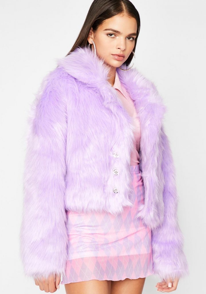 Für das Rebellenmädchen, das immer noch einen Hauch von Weiblichkeit will, ist dieser plüschige Flieder-Look, auf den Cardi B stolz wäre. Es ist aufgereift und perfekt für ein kurzes Kleid- und Oberschenkelhöhe.