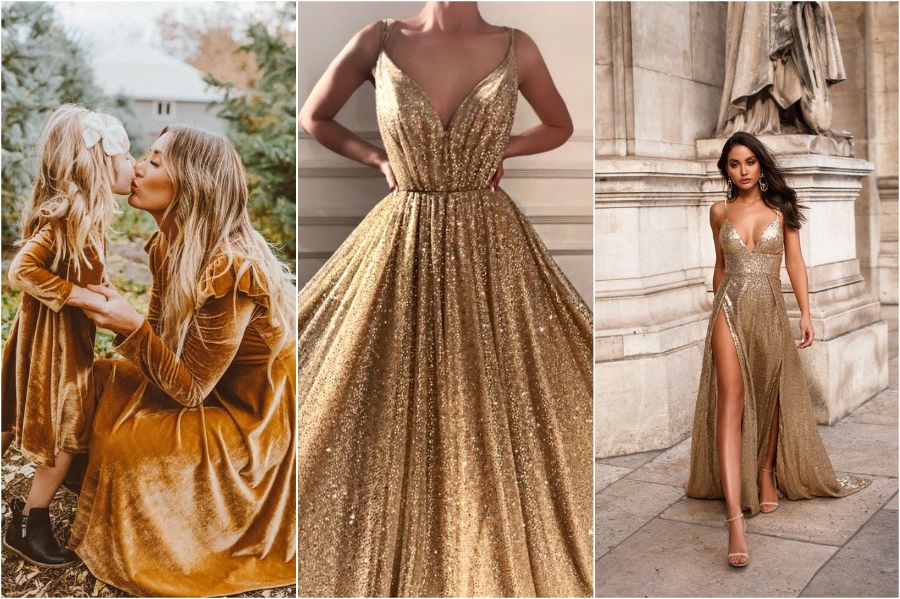Gold kann auch Wohlstand symbolisieren, aber nicht nur finanzielle, sondern auch emotional. Es ist eine festliche Farbe, die häufig für Feiern verwendet wird, und es ist wirklich leicht, ein Stück Gold mit Accessoires oder einem Paar Goldabsätzen ein wenig Gold hinzuzufügen.