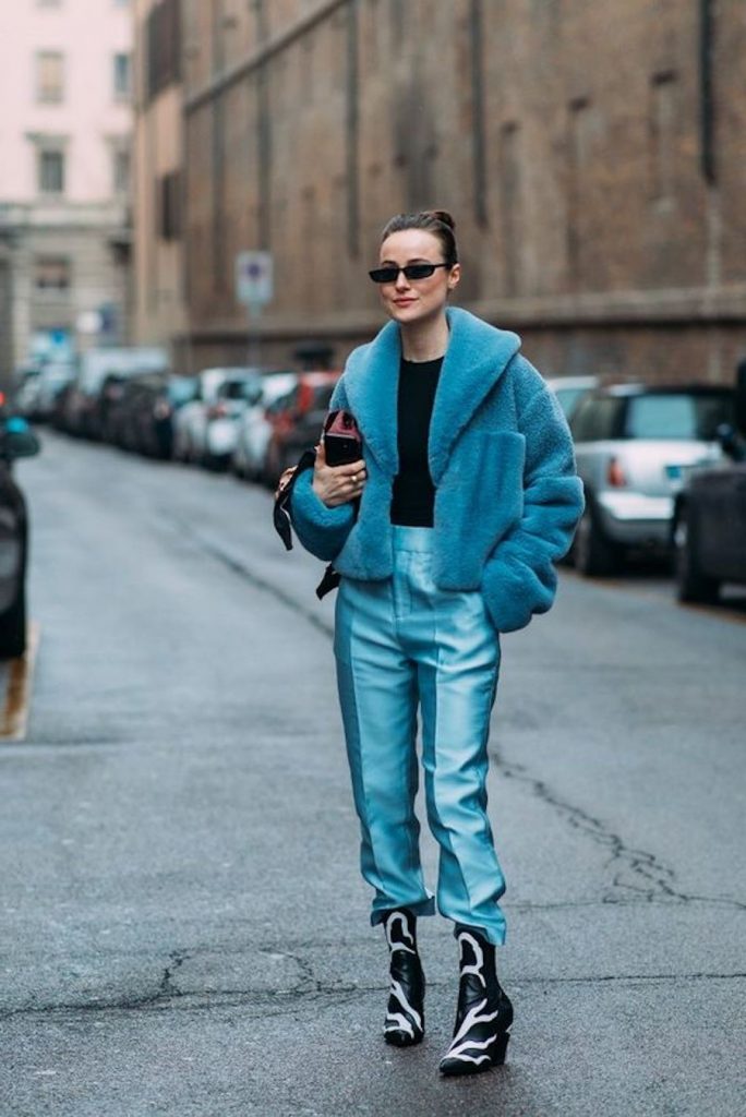 1. Kombinieren Sie für ein subtiles Yeteye-Fang-Aussehen die helle Farbe mit einem neutralen Base. Haben Sie keine Angst, mit Texturen zu spielen. Dieser blaue Jean und das Faux-Furjacket machen auf jeden Fall eine Erklärung, aber das schwarze Hemd und das schwarze Hemd mit dem Brötchen tonte es auf ein lässiges, aber anspruchsvolles Outfit.