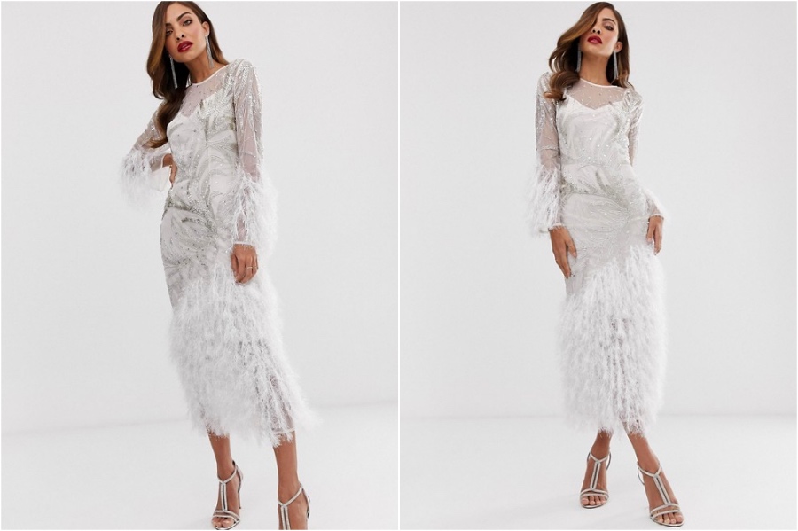 12. Ein weißes, federndes Kleid mit den Sämbellierungen scheint eine großartige Wahl für ein elegantes Silvester-Partei, an dem Sie wie eine Winterkönigin aussehen möchten.