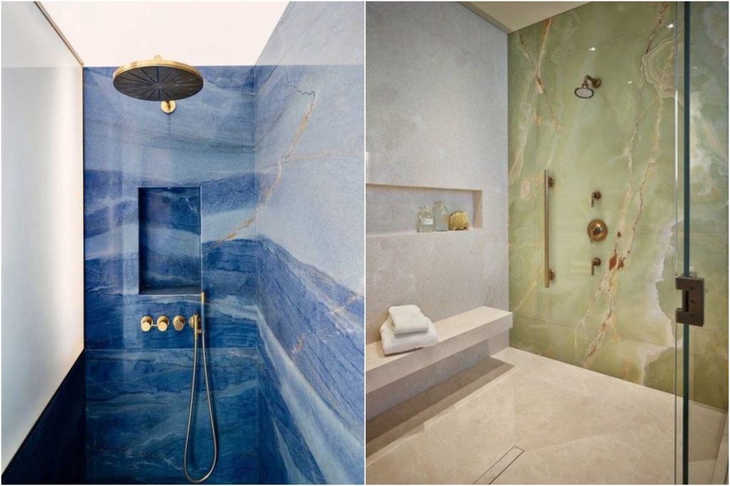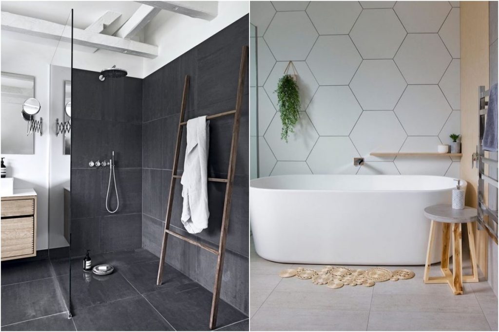 Einmal galt winzige Mosaikfliesen als die schickste Ergänzung zu einem Badezimmer. Aber heute haben Badezimmerwände, die einen größeren Oberflächenbereich abdecken, zu Traktion. Sie zeigen weniger Mörtellinien und sehen luxuriös aus, insbesondere wenn sie mit einem Naturstein gepaart oder ein Material, das Stein nachahmen.