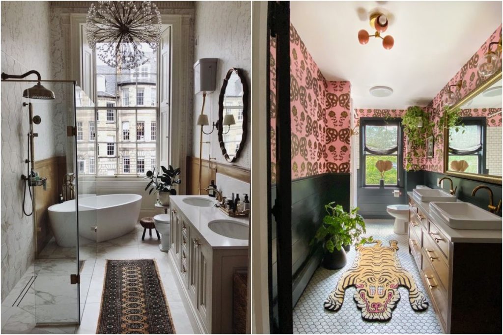 Es kann verlockend sein, passy-passy in einem Badezimmer zu gehen, aber in Betracht ziehen, den inneren Innenraumdesigner (und der Wildnis) mit einer ungewöhnlichen Mischung aus Materialien zu kanalisieren, die Sie normalerweise nicht daran denken würden. Wir denken an verschwenderische Kronleuchter mit funky Fliesen und einem abgewinkelten Wanne.