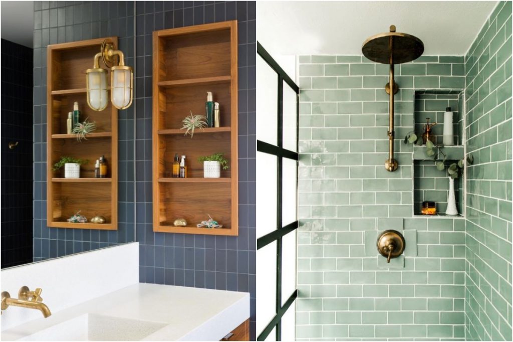 Mangel an Platz in Ihrem Badezimmer? Betrachten Sie eine eingebaute Regal-Nische, die alles von Büchern zum Pflegen von Essentials und Duftkerzen halten kann, die Sie für die Badewanne verwenden. Diese funktionalen Add-Ons sind nicht nur praktisch, sie sind auch elegant und streben auch.