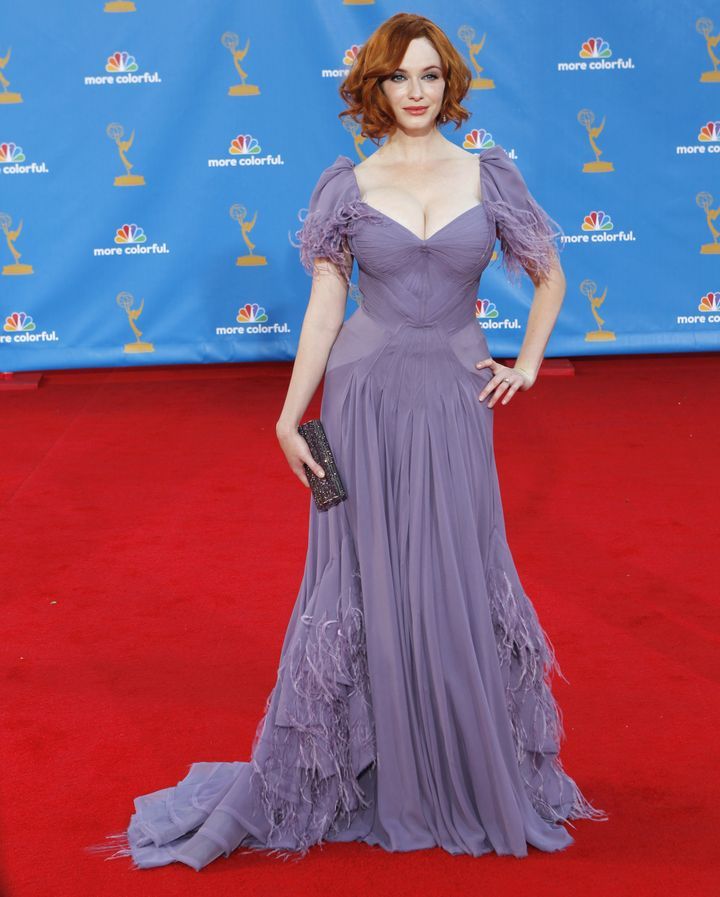 Wenn Sie direkt bei Mad Men Star Star Christina Hendricks ansehen, ist es irgendwie, wie man direkt auf einen brillanten Phönix blickt. Posen nahm diese Vogel-Metapher mit diesem wunderschönen Off-Taupe-Look, der Hommage an Joan Crawford und ihre Ära der Sterne bezahlt. Die Feder, die an den Ärmeln und in Richtung des Zuges detailliert ist, ist nur die richtige Menge subtiler.