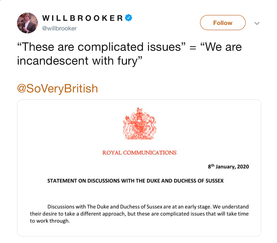 Themedia entschied sich dafür, diese Aussage als Königin zu interpretieren, die mit dieser Entscheidung nicht wurde, und nicht mit ihrer Zustimmung. Einige Haveeeven schlug vor, dass humorvolle Interpretationen dieser Erklärung auf Twitter den Linien der "Dies sind komplizierte Themen" = "Wearde Glühlampen mit Fury" gegangen. Viele der Boulevards sprangen auf diesen Bandwagon, und die Öffentlichkeit scheint sehr verwirrt zu sein, was ist, was ist, was passiert, und wie wirkt sich dieser Affekt Großbritannien und das Royalfamily auswirken.