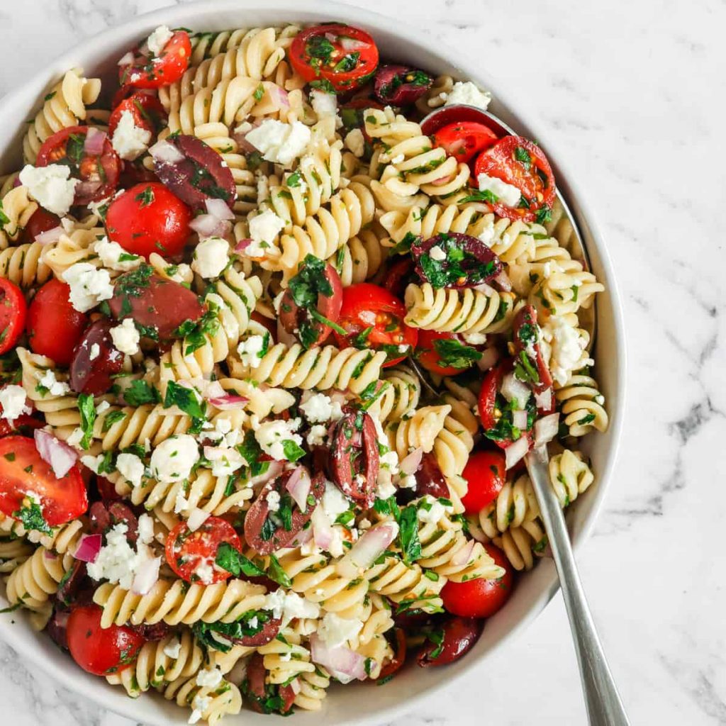 Dieser Salat ist eine salzige, aromatische Wahl und bringt alle klassischen Aromen der mediterrannischen Küche zusammen. Es fordert Oliven, Kirschtomaten, rote Zwiebel und Rucola mit etwas Gewürzen. Es wird mit zerbröckeltem Feta-Käse gekrönt. Diese schöne Kombination von lila, rot und Grüns ist eine großartige Ergänzung zu Ihrer Mahlzeit.