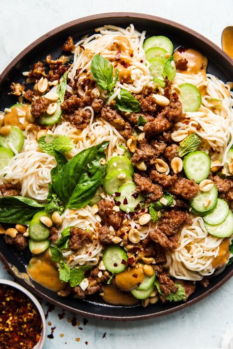 Dieser köstliche Salat ist von der thailändischen Küche und ist so lecker. Es kombiniert ein knackiges Erdschweinefleisch, das thailändische Erdnuss-Dressing, frische Minze, Basilikum und Gurken, die alle auf Reisnudeln belasten. Es sind kalte Zutaten und frische Minty-Aromen sind definitiv ein guter Sommervergnügen.