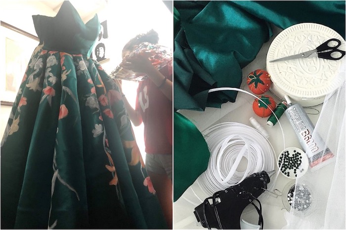 Es dauerte 13 Yard des Stoffes, sie tat das Kleid, das sie selbst tat, und als sie es zusammen nähte, nähte sie die Blumen auf ihr Kleid. Es brauchte ihre fünf vollen Tage, um die Blumen zu tun. Und Ciara wollte nicht für Standart-Floralpattern oder klassische Rosen gehen, stattdessen entschied sie sich, Tiger Lillies zu zeichnen, dass sie sich eher für sie fühlte, und sie liebte den Kontrast von Ourange Blumen auf ihrem grünen Kleid. Darüber hinaus verzierte sie Tore mit Swarovski-Kristallen. Von und weißt du, warum sie für AGENEN-Kleid ging? Weil sie ein großer Harry Potter-Fan und ein Vorgängertherin ist.