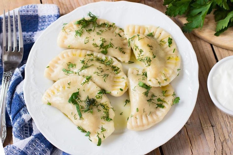 Varenykyare ukrainische Knödel. Es gibt viele Variationen dieses Geschirrs und der Andit kann süß oder wohlschmeckend gemacht werden. Sie hätten auch von Pierogi gehört, es ist im Wesentlichen dasselbe. Das klassische varenykyare, das mit Kartoffelkartoffel füllt, sind dann gekocht und serviert mit saurer Sahne. Andere beliebte Variationen von Varenyky werden mit Kabending-Füllung, Hüttenkäse und den beliebtesten Süßen mit Kirschen, Äpfeln oder Blaubeeren hergestellt. Sweet varenyky sind in der Regel mit Honig anstelle von Sauerrahm getränkt.