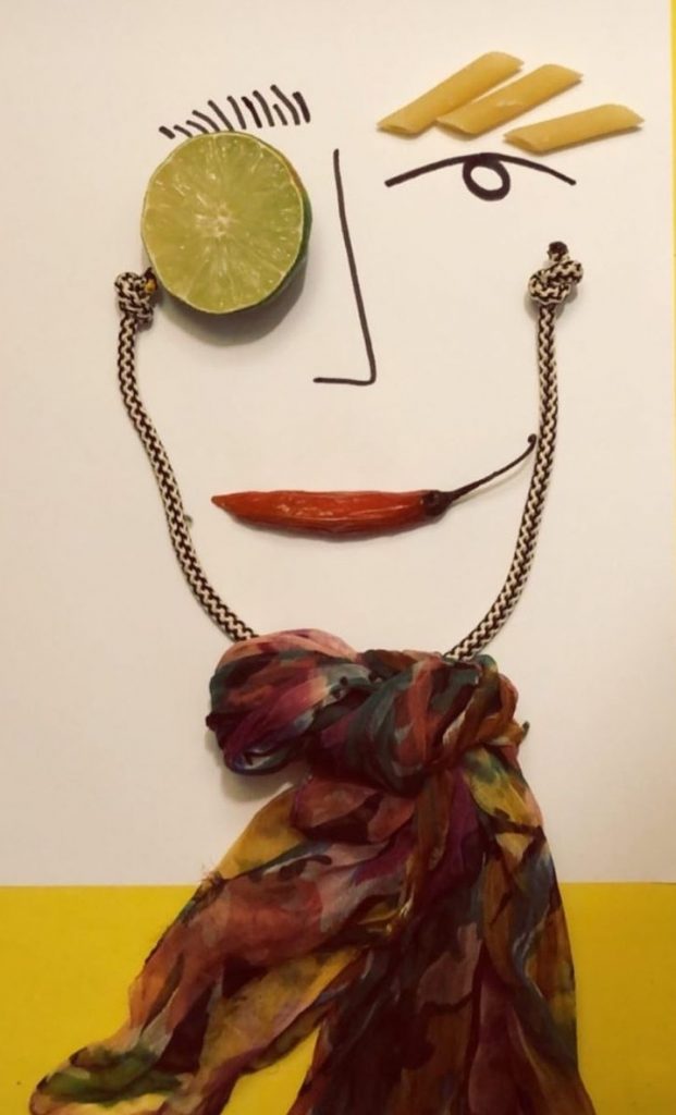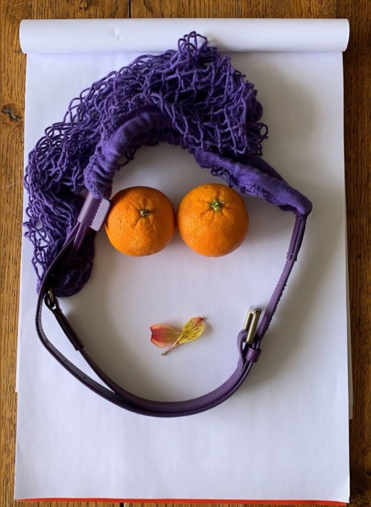 2. Hier entschied sich die Designer ein wenig Farbe auf hiswhite Papier Leinwand ziehen lassen. Augäpfel sind aus zwei Orangen hergestellt, während die Lippen madefrom zarten Blütenblätter, und das Haar ist ein funky lila verrechneten Tasche sind.