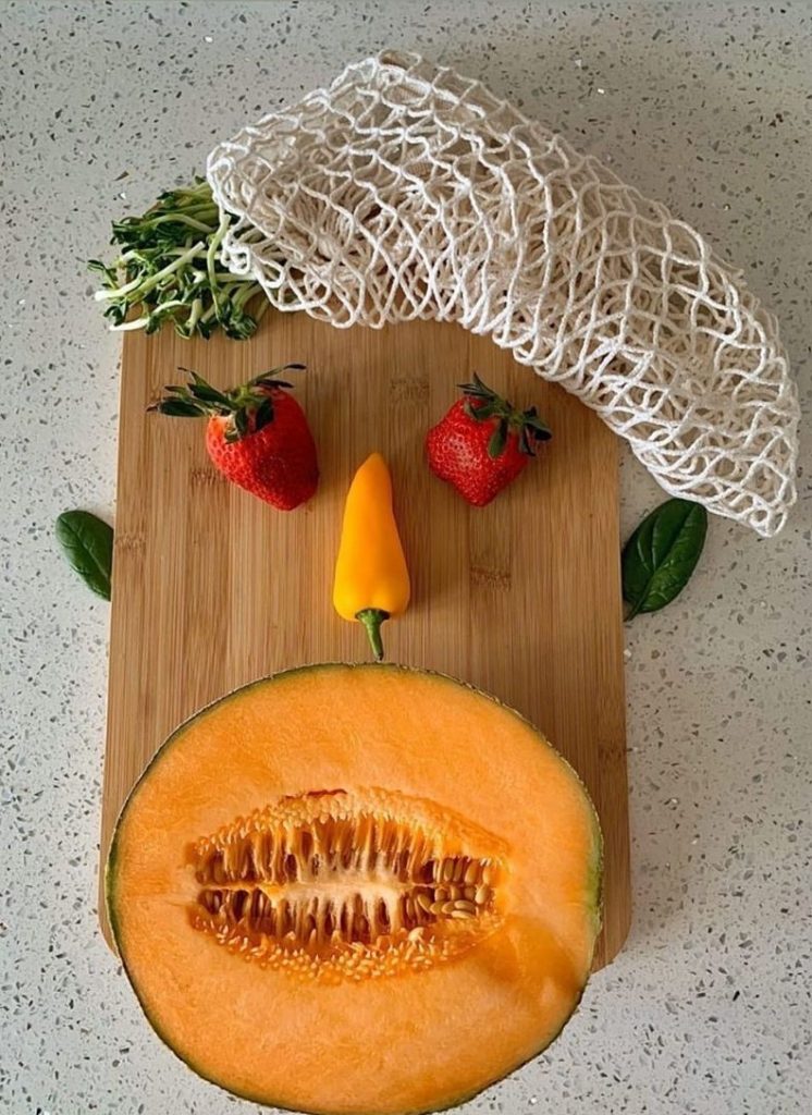 13. Jemand beschlossen, fruchtig auf diesem Schneidebrett Gesicht Witha zu bekommen aufschneiden Cantaloupe für Mund - Blick auf diesen perfekten Zähnen! Eine gelbe Minibell Pfeffer Art der Spiele, dass Farbpalette, während Erdbeeren signifyeyes.