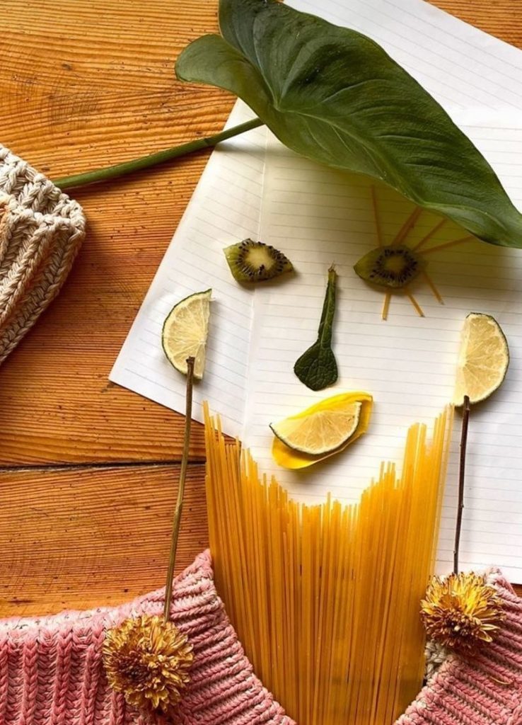 7. Nicht sicher, ob thespaghetti soll ein Hals oder einen Bart für diesen Look sein, aber wir lieben es eitherway. Kiwis für die Augen sind so schön, aber die Sonne wird sie nicht durch ruiniert schattiges Blatt für die Haare ABIG. Citrus macht die Augen und den Mund, während ein artfullycut Blatt für eine Birne Nase macht.