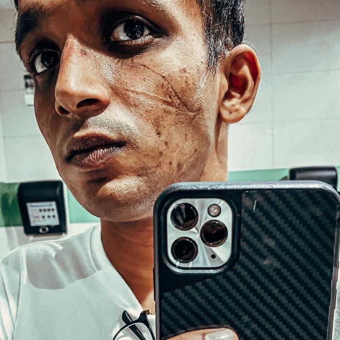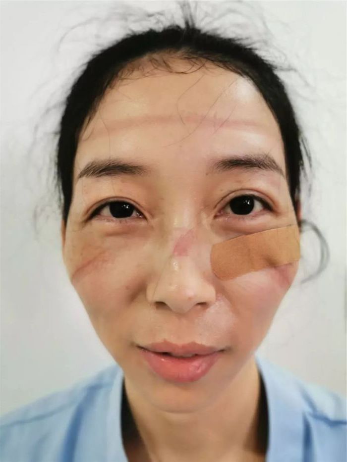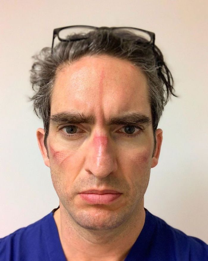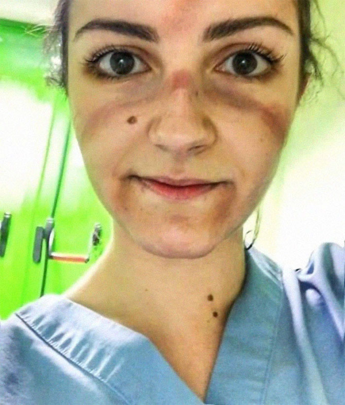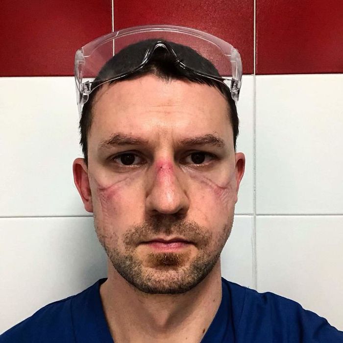 1. Dieser arme ICU-Arbeiter hat Blutergüsse, von wo aus seinen Goggle-Marken sind, da er sie seit über 13 Stunden trägt. Die meisten Chirurgen und andere Ärzte, die während der COVID-19-Pandemie arbeiten, leiden an denselben Gesichtsmarkierungen. Sie sind die Marken von harter Arbeit und Hingabe.