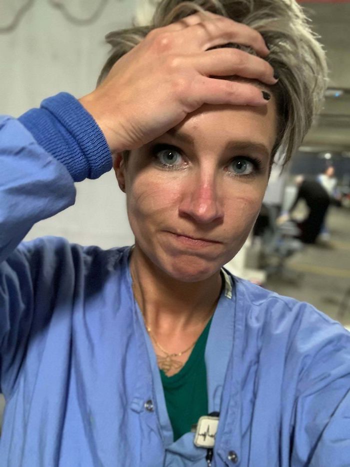 3. Diese Gal lügt ihren Kopf irgendwo hinunter und sieht erschöpft aus. Sie war seit über einem Jahrzehnt eine kritische Pflegekrankenschwester, dies ist jedoch das erste Mal, dass das Gesundheitssystem auf diese Weise überwältigt sei. Ihre Beschriftung ist herzzerreißend, diskutiert die verschiedenen sterbenden Menschen, die sie auf dem Job unterstützt, unter einer Million anderer Dinge.